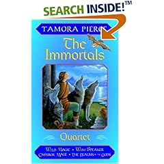 The Immortals is a quartet (of books) that includes "Wild Magic", "Wolf-Speaker", "Emperor Mage" and "The Realms of the Gods". It is young adult fiction set in the realm of Tortall, popularized by Pierce in her previous (to this one) quartet "Song of the Lioness". The Immortals tells the story of Daine, at the start only a 12 year old orphan, who has the unique "wild magic" power of being able to communicate with animals, and how she develops her talents in the defense of her friends and Tortall.